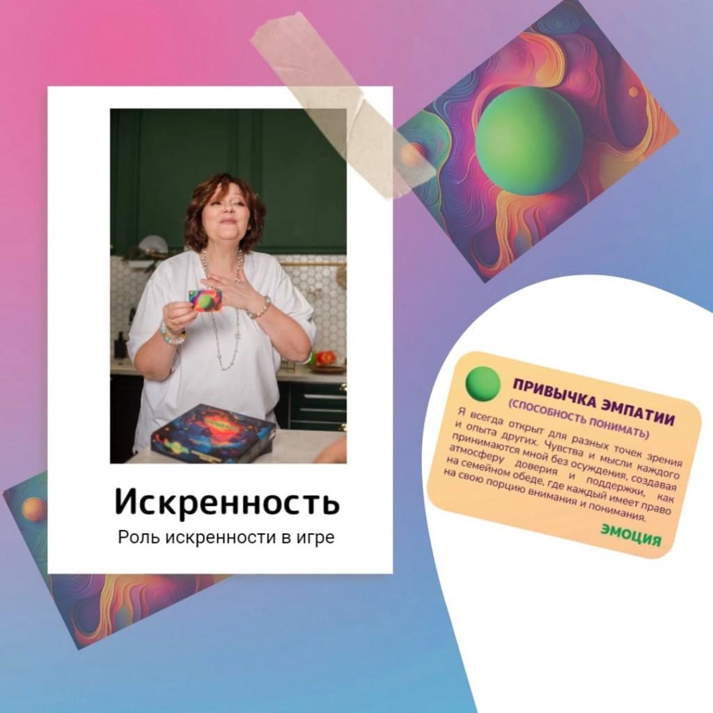 Важно отметить, прежде чем совершить свой ход, игроку предоставляются на выбор цели, основываясь на своих желаниях и стремлениях игрок выбирает одну из предложенных. Уже на этом этапе игрок, вытянув близкую ему цель, желанную, начинает непроизвольно улыбаться и внимательно изучать, что же ему понадобится для ее достижения, так появляются намерения и интерес к игре. И уже в разгар игры, когда каждый игрок набирает карточки и выполняет задания, он моделирует или вспоминает различные события и эмоции, которые он пережил или собирается пережить, делясь с каждым игроком своим опытом. В этот самый момент искренность и проявляется, человек начинает святиться как маяк, в его глазах появляется огонек, а голос приобретает уверенность. И самое интересное, этот эффект передается другим игрокам, как в цепной реакции люди начинают делиться своими эмоциями, мыслями и опытом все дальше и дальше раскручивая тему каждой карточки, которая нашла отклик в них, приближая к победе в игре. И в результате, малознакомые люди искренне и свободно общаются друг с другом, смеются и улыбаются, передавая друг другу позитив и положительные эмоции. Завершив партию, игроки рады за победителя или победителей, делятся контактами и планируют совершить вместе события, которые им попадались в игре, но уже в реальной жизни. Так, например, кто-то обливается холодной водой и записав видео делится с другими игроками этой прекрасной и новой для него привычкой, кое-кто собирает людей, чтобы весной пойти запускать воздушного змея, а кто-то решил встать на сноуборд уже в грядущий сезон.